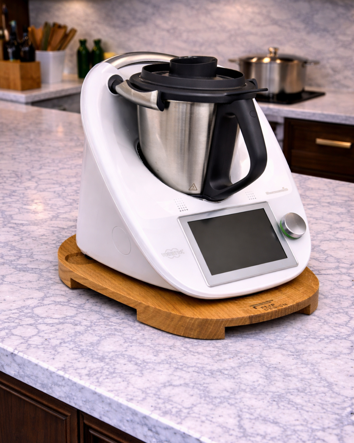 Pourquoi choisir la Planche à Momo ? Fabriquée à partir de bois de haute qualité, cette planche est non seulement respectueuse de l’environnement, mais elle est aussi robuste et durable. Elle offre une base solide pour votre Thermomix, réduisant les vibrations pendant l’utilisation et protégeant vos surfaces des marques indésirables.