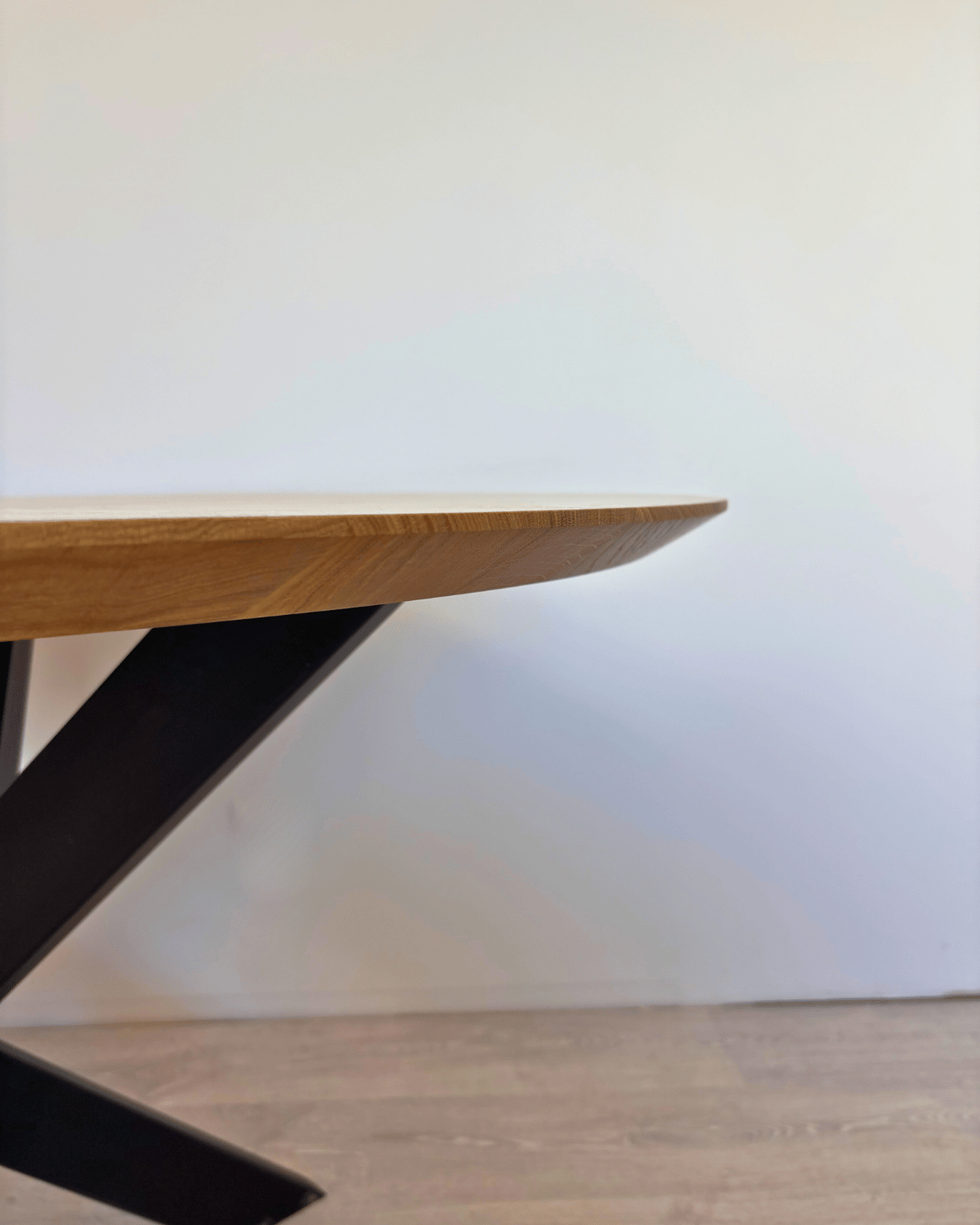 Avec son plateau en chêne massif, cette table offre une surface naturelle aux nuances chaleureuses et à la texture unique. Chaque veinure du bois raconte une histoire, faisant de chaque pièce une création exclusive. Le pied en métal noir, en forme de croix géométrique, ajoute une touche audacieuse et moderne, tout en garantissant une parfaite stabilité.